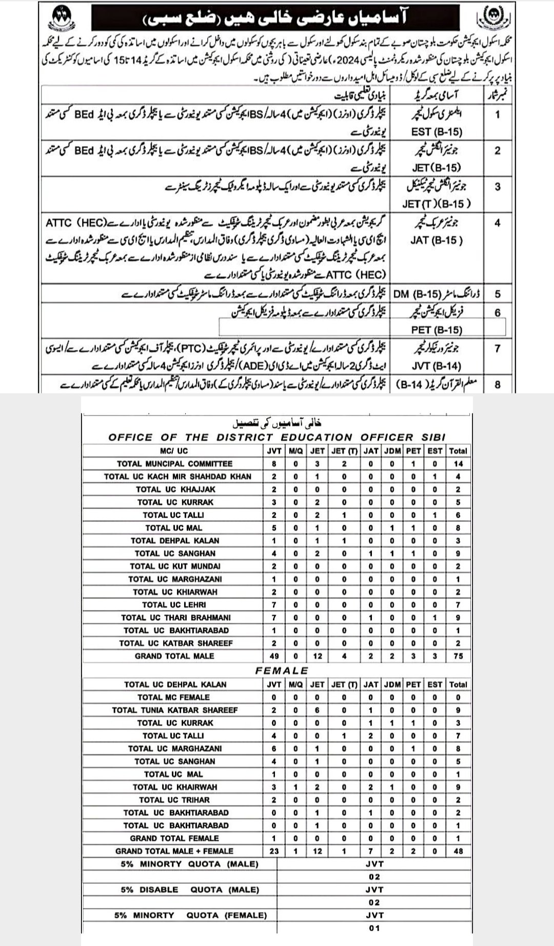 Apply for District Education Officer Sibi Jobs 2026. Teaching vacancies include EST, JET, JAT, PET & DM (B-15/B-14). Eligibility criteria, merit formula, how to apply