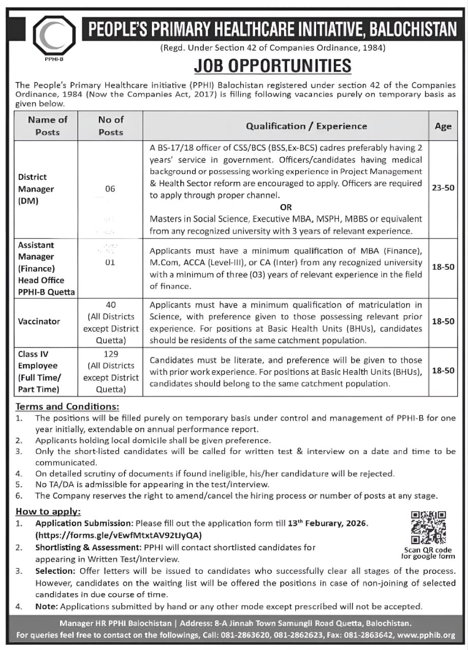 People’s Primary Healthcare Initiative (PPHI) Balochistan has announced multiple job opportunities for 2026 on a temporary basis. 📌 Organization:People’s Primary Healthcare Initiative (PPHI-B) 📌 Available