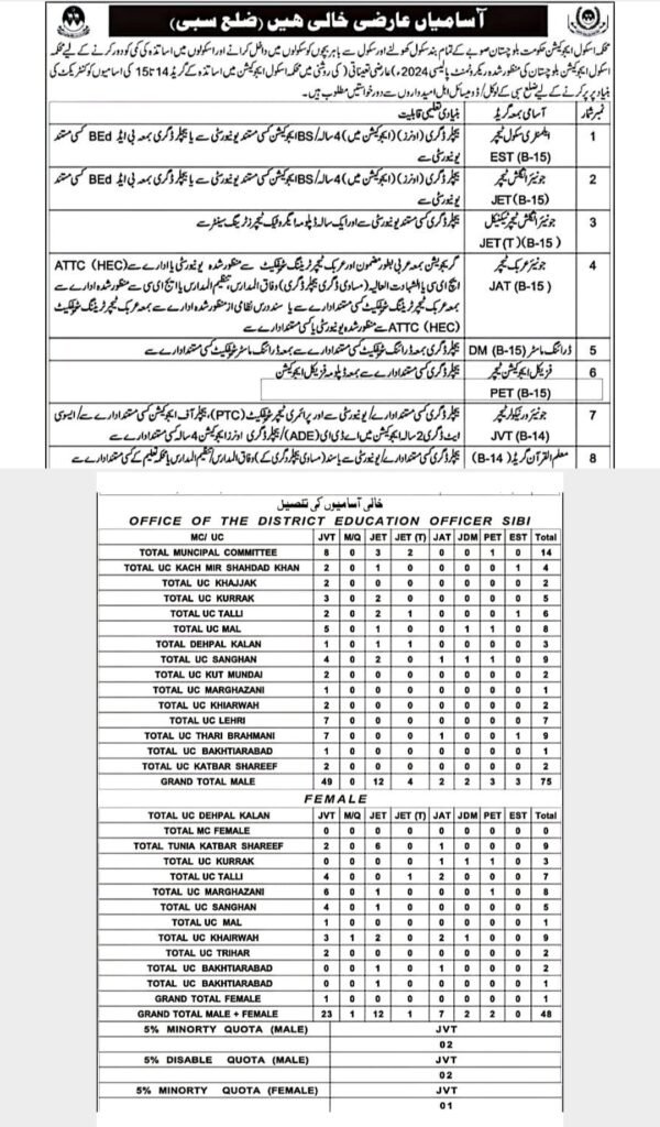 District Education Officer Sibi Jobs 2026 are now announced for both male and female candidates. A total of teaching and administrative vacancies are available under the Balochistan Education Department including posts of EST (B-15), JET (B-15), JET(T) (B-15), JAT (B-15), PET (B-15), DM (B-15), JVT (B-14) and teaching positions for primary and secondary schools. These positions are open for candidates having ADE, B.Ed (Hons), BS Education or equivalent qualifications with age limit up to 55 years as per government rules.