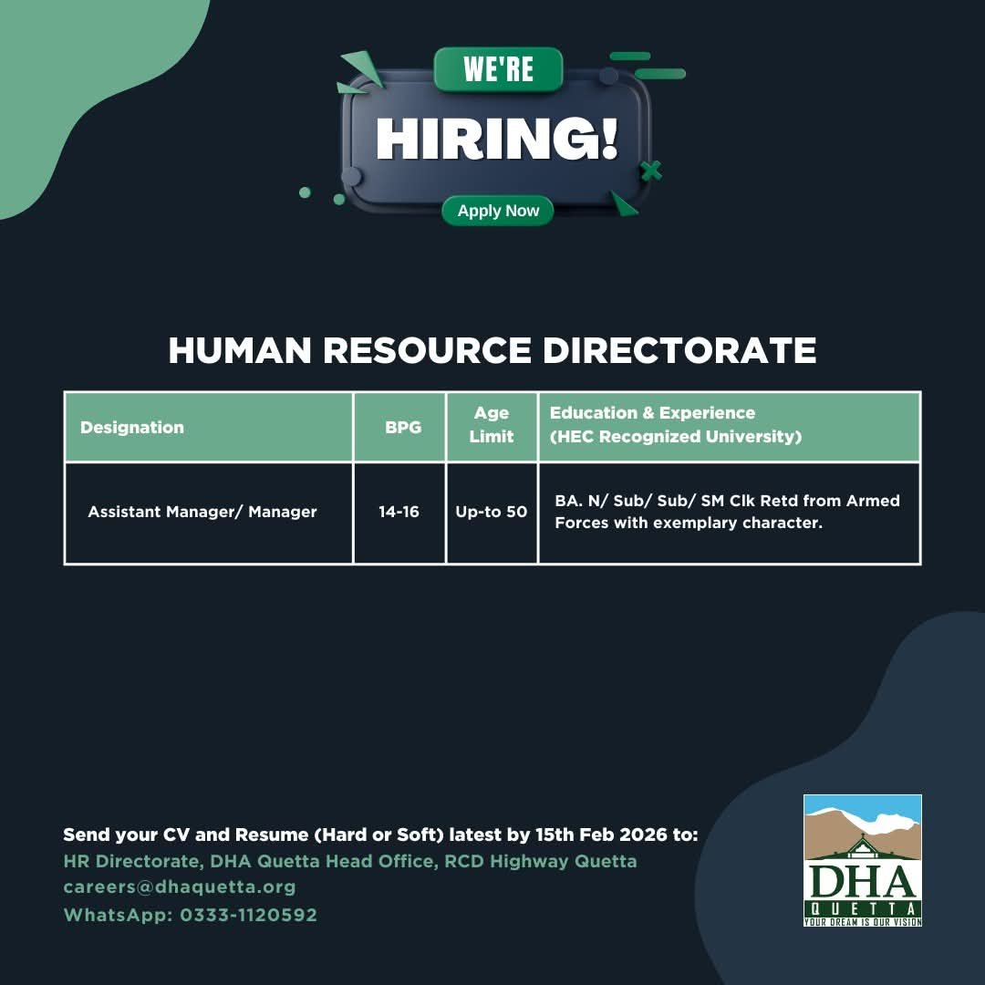 The Human Resource Directorate, Defence Housing Authority (DHA) Quetta is inviting applications from qualified, experienced, and motivated individuals for the position of Assistant Manager /