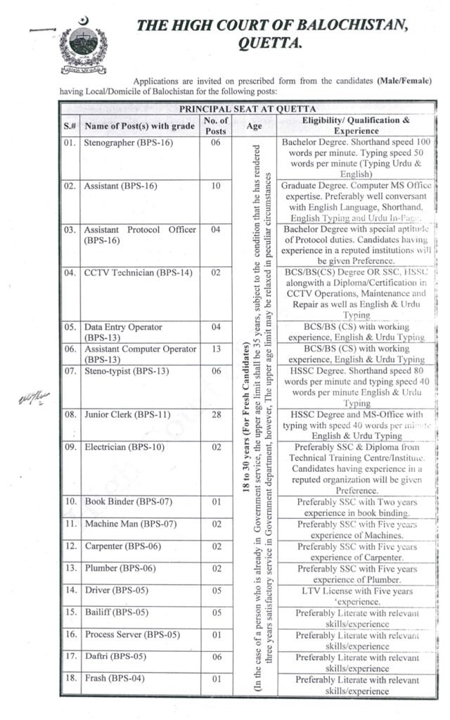 These vacancies are highly suitable for candidates searching online for high court of balochistan jobs 2026, clerical jobs in balochistan, computer operator jobs, stenographer jobs, and class four jobs in balochistan.